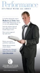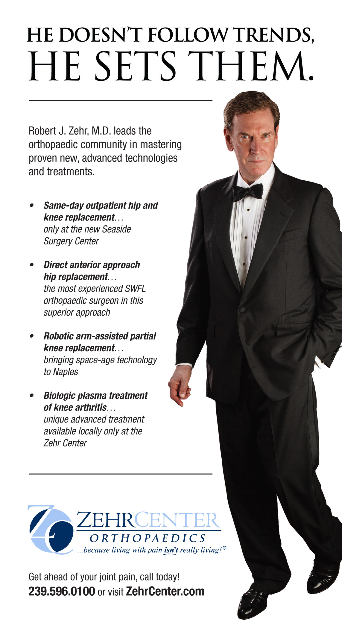 For an ad in a regional lifestyle magazine, I positioned Dr. Zehr as a trendsetter. He pioneered the direct anterior approach to hip replacement in the area and performed the first outpatient hip replacement in Southwest Florida. As a founding partner of the first outpatient surgery center in SWFL designed and built for joint replacements, he is indeed a trendsetter. To the list of his specialties, I added descriptions like “superior approach,” “space-age technology,” and “advanced treatment,” along with a call to action for readers to “Get ahead of your joint pain, call today!”