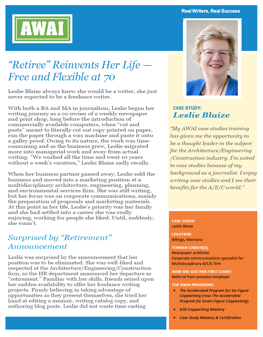 Upon completing the coursework for AWAI’s Case Study Mastery & Certification program, a test was administered and a spec assignment was required. I chose Leslie Blaize of Blaize Communications, who specializes in case studies herself, as my subject. Of my submission, the reviewer said: “Your strength in humanizing Leslie’s writing journey was evident from the first paragraph where you provided a thoughtful overview of her background and brought her lived experiences to life through your engaging writing style. I believe you have a profound appreciation of the art of case studies. It was a pleasure to engage with your assignment!” (And yes, I scored 100%). Read her story here.